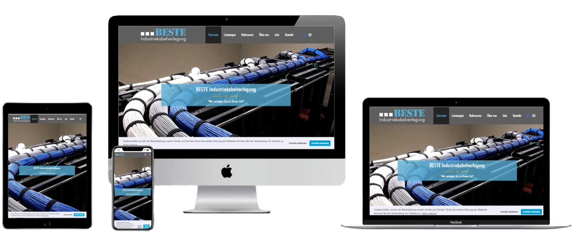 Bei BESTE Industriekabelverlegung wollten wir die technische Kompetenz und Zuverlässigkeit des Unternehmens greifbar machen. Wir entwarfen eine klare Informationsarchitektur, welche die verschiedenen Kabelbereiche strukturiert darstellt, und ergänzten sie durch Zertifikatsnachweise und Referenzen. Die professionelle Gestaltung unterstreicht die Expertise und Zuverlässigkeit des Unternehmens.