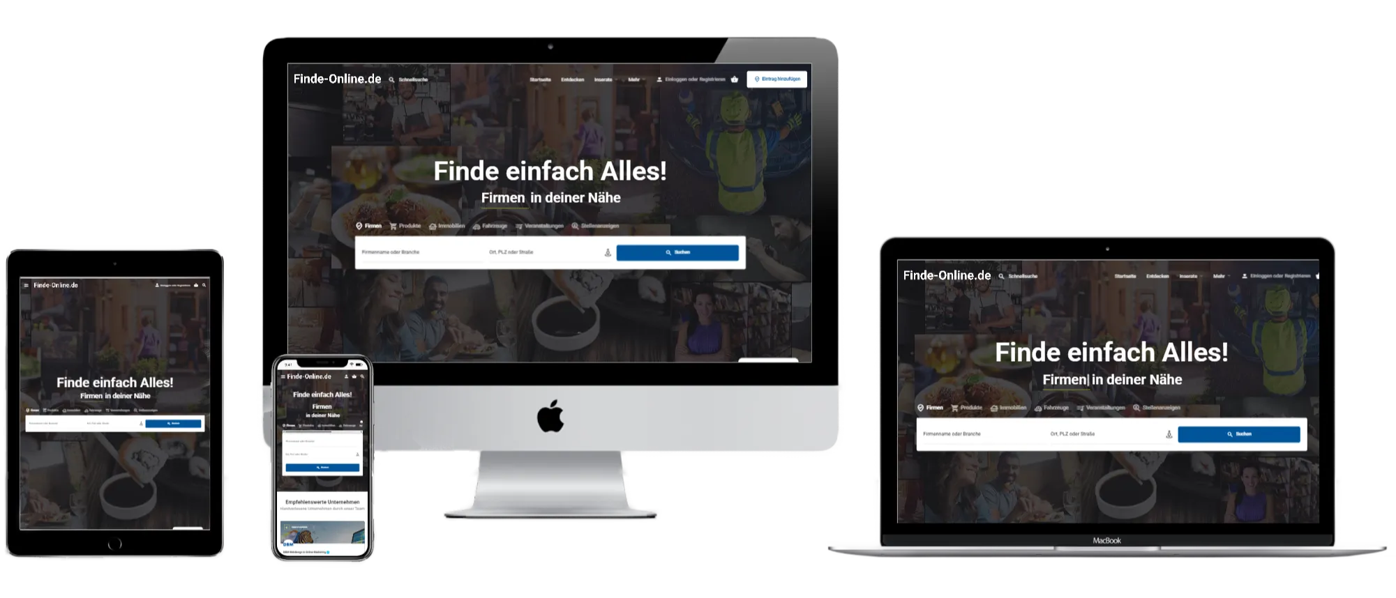 Bei Finde‑Online.de stand die Nutzerfreundlichkeit einer regionalen Suchplattform im Vordergrund. Wir entwickelten eine leistungsfähige Such‑ und Filterfunktion, präsentierten die Kategorien übersichtlich und erarbeiteten ein klares Nutzerkonzept, das sowohl Suchende als auch Inserenten anspricht. Dadurch entsteht ein Portal, das eine einfache Navigation ermöglicht und zur Erkundung einlädt.